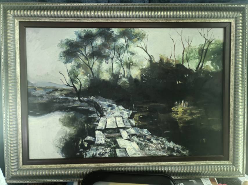 由本人家人亲自绘画,家人是广美毕业,本画作已绘制好约一年,尺寸50*70,加上外框约55*75,是风水山水画,非常适合放置家中,带来财运好运,整个油画选用上等材料(优质亚麻布,结实木框,马利油画颜料等)所有工序都是家人亲自搞好(包括装订,涂油等),因此都是质量很好,放置100年以上都没问题,耐用实用美观。独一无二非行画,立体感强